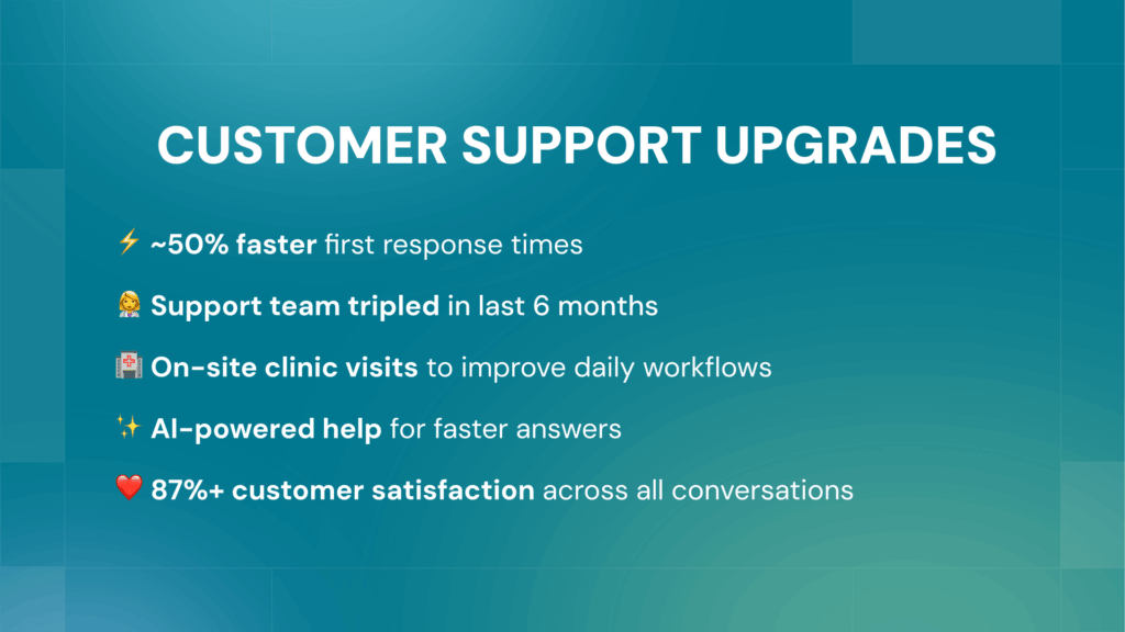 Across all support interactions, CSAT is now 87%, with clinics consistently highlighting speed, clarity, and follow-through.